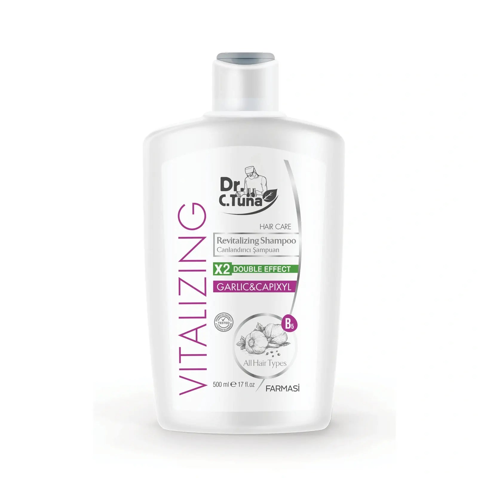 Dr. C. Vitalizing Garlic&Capyxil Revitalizing Shampoo, 500 мл. - Шампон За Коса Ревитализирачкиот шампон со нова формула ви носи ефикасно решение за сите типови на коса која се соочува со проблемот на паѓање. Посебно се препорачува за јакнење на тенките и кршливи влакна. Унапредената технологија сега дава двојно повеќе сила од екстрактот од лук и capixyl кои ја ревитализираат структурата на влакното, заздравувајќи ги оштетените делови и поттикнува раст на косата. На косата и се враќа силата, гистината и сјајот.